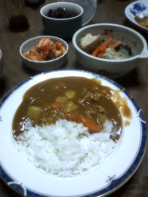 今日の昼ごはんはカレー、キムチ、がんもどき、しぐれ