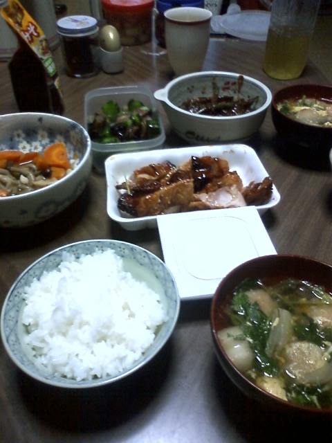 さてさて今日の昼ごはんは、白米、お吸い物、納豆、照り焼きチキン、煮物、その他ごちゃっといろいろ