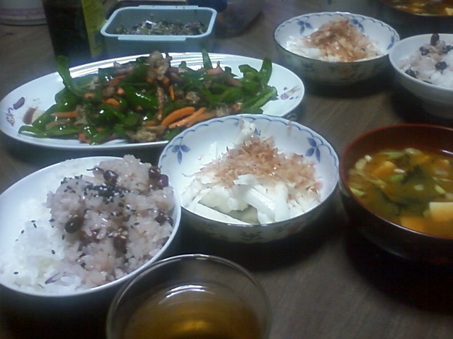 今日は、赤飯丼とでも呼ぼうか、みそ汁、山芋、ピーマン炒め、ベーコンとキウイ