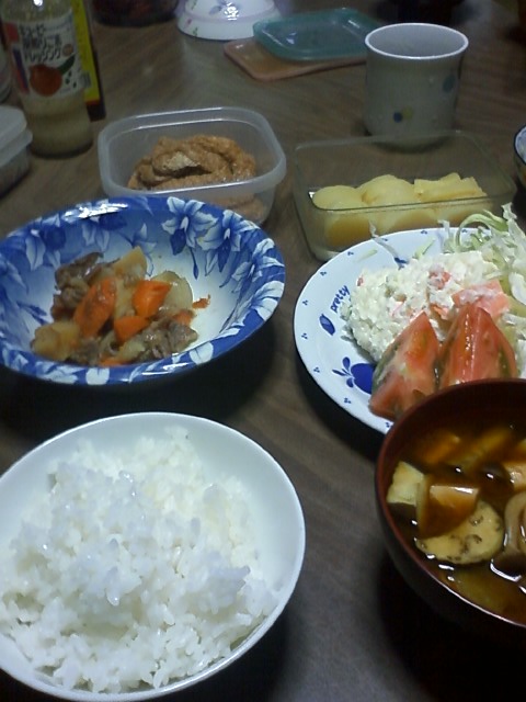 今日は、白米、みそ汁、いなりのあげ、肉じゃが、サラダ