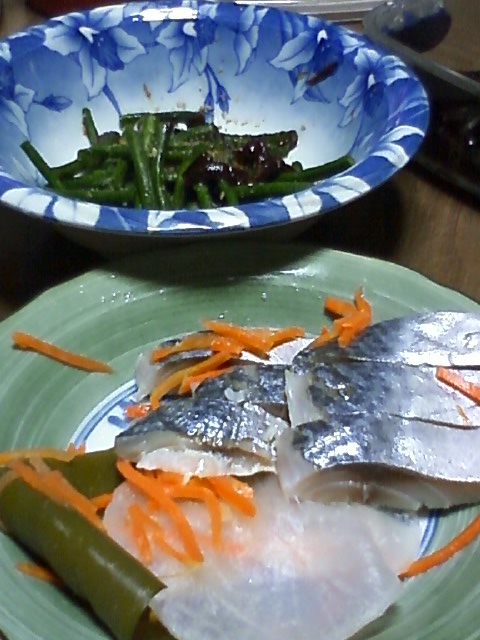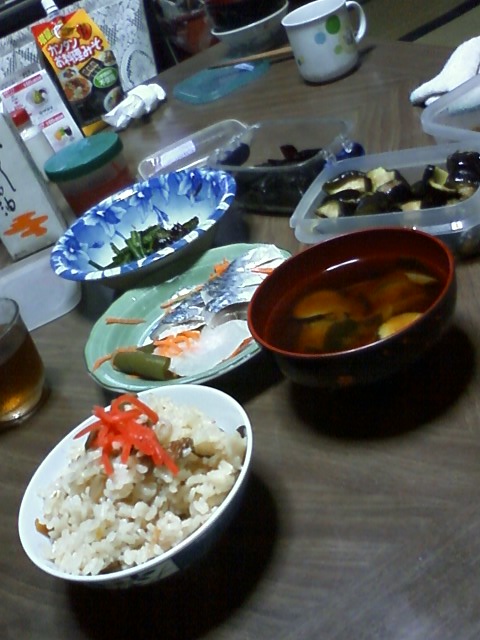 今日は炊き込みご飯、みそ汁、シメ鯖、ナスの漬物、昆布の佃煮