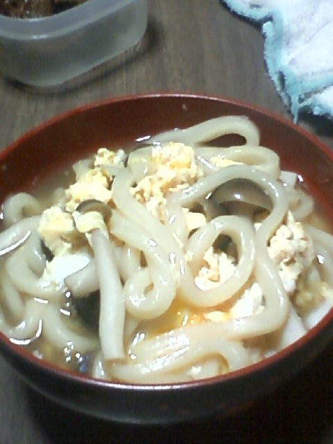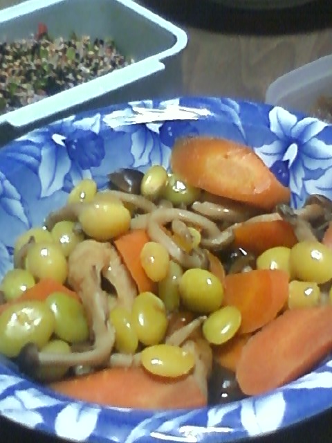 今日のお昼は、2色ご飯、うどん、サラダ、いろいろ煮たもの、その他