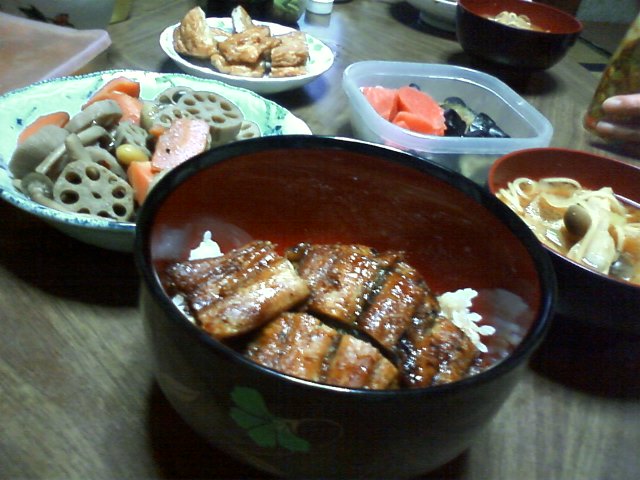 今日は、うな丼、みそ汁、れんこんの煮物、はんぺん、つけもの