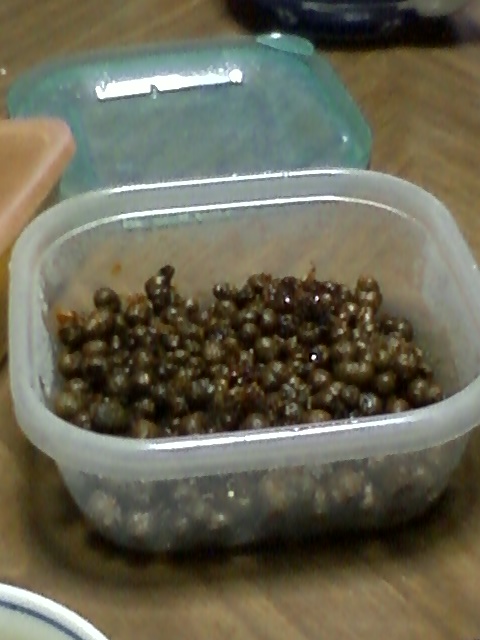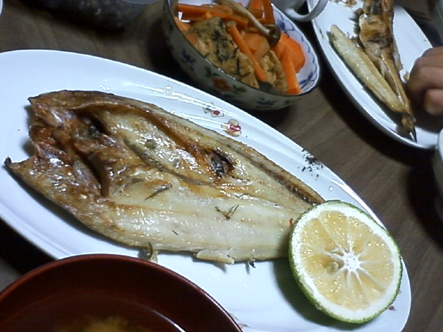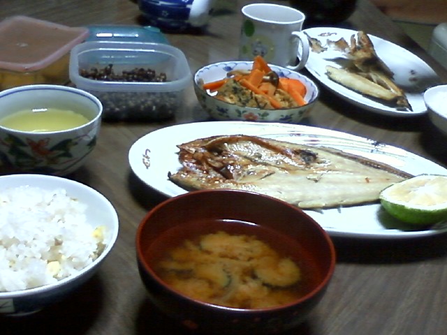 今日のごはんは、ほっけ、栗ごはん、みそ汁、がんもどき、わけのわからん茶色いつぶつぶ