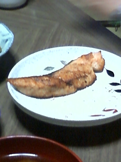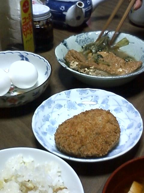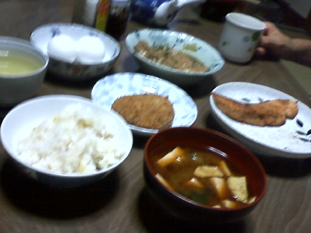 今日のごはんは、また栗ごはん、みそ汁、コロッケ、焼鮭、がんもどき、ゆで卵