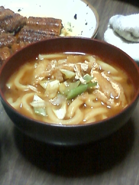 今日のごはんは、白米、うなぎ、みそ汁うどん入り、がんもどき、ししとう