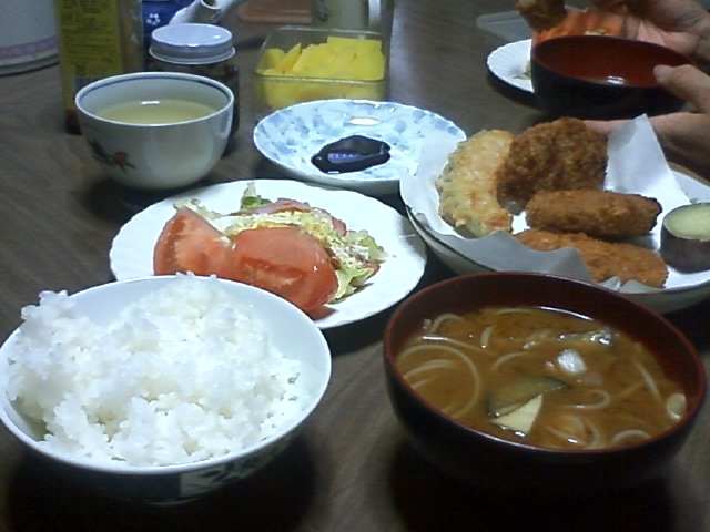 今日のお昼は、白米、そうめん入りみそ汁、揚げ物(コロッケ・メンチカツ・カボ天)、サツマイモ、トマト、野菜炒め