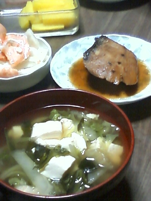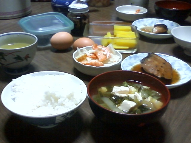 そんな本日のお昼ごはんは、白米、汁物、煮魚、鮭のマリネ、ゆで卵