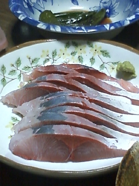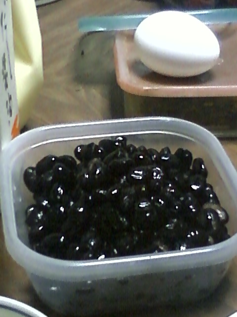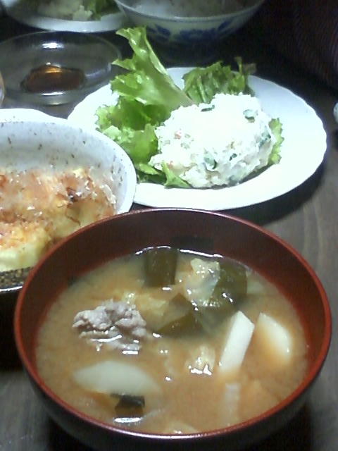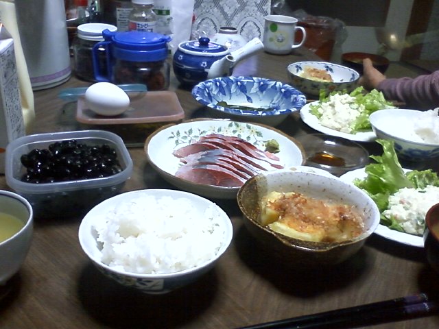 白米、けんちん汁、はまちの刺身、揚げだし豆腐、ポテトサラダ、ゆで卵、黒豆、高菜の漬物、昨日のピーマン炒めの残り