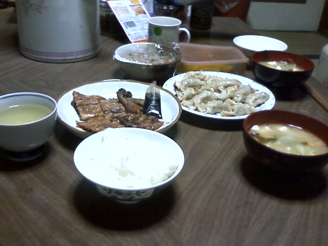 今日は、白米、みそ汁、うなぎ、餃子、昨日のれんこん