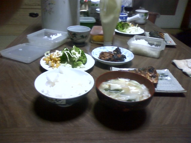 今日のごはんは、白米、みそ汁、焼き魚、照焼きチキン、たぶんコーンサラダ
