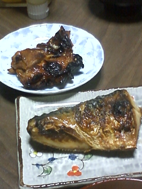 焼き魚と照焼きチキンが並ぶ。