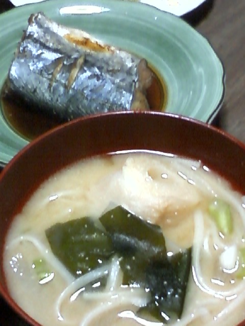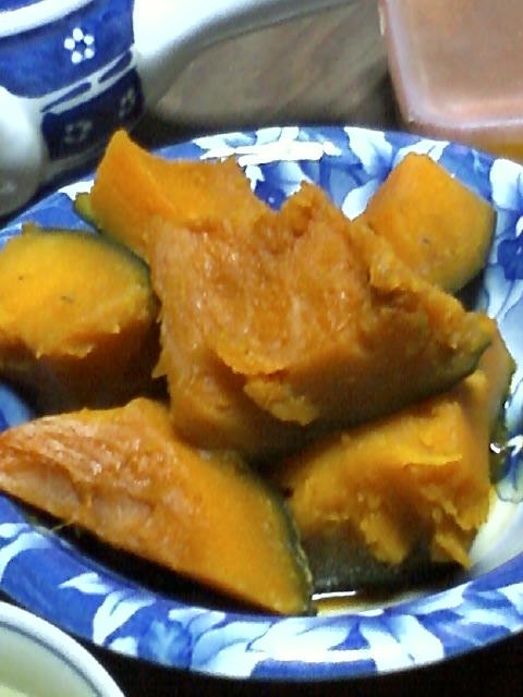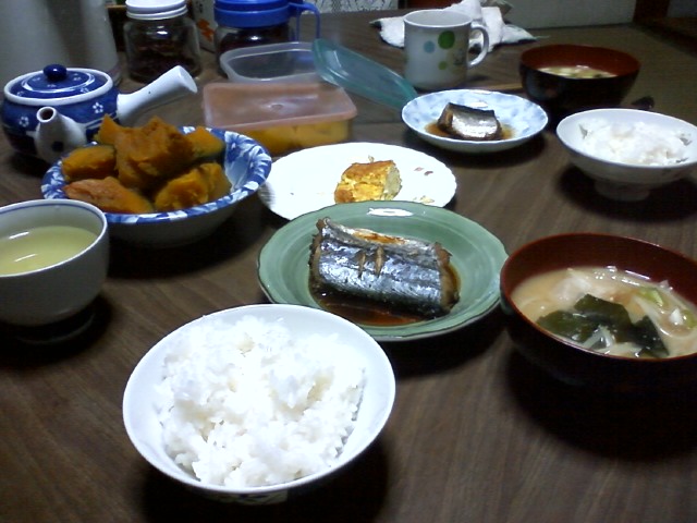 今日のごはんは、白米、みそ汁、煮魚、煮かぼちゃ、玉子焼きです