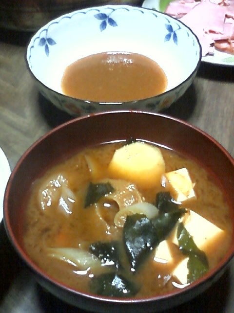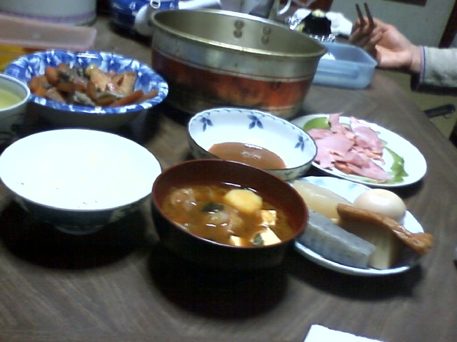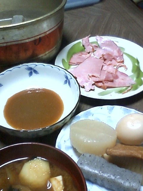今日はおでん あとは白米、みそ汁、煮物、ハム