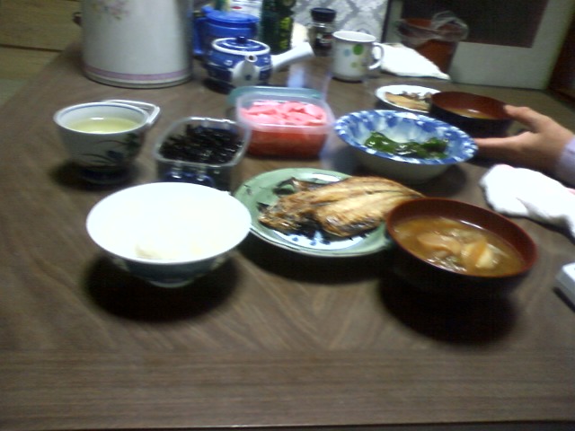 そんな冬の日の昼ごはんは、白米、みそ汁、ピーマン炒め、あじ、カブのつけもの、昆布の佃煮