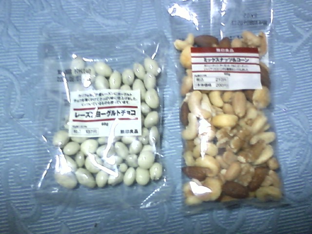 無印のレーズンヨーグルトと、おそらく酒のつまみのミックスナッツ