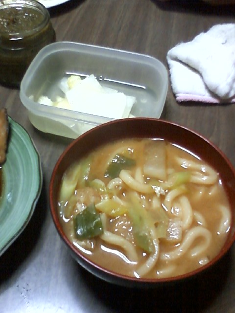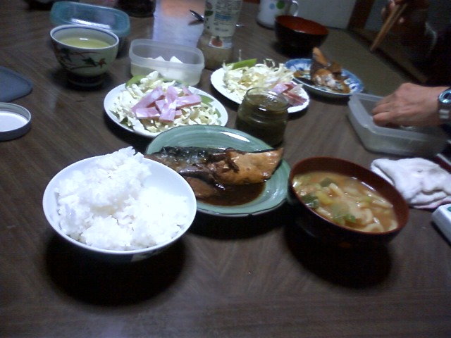 今日の昼ごはんは、白米、うどん入りみそ汁、魚の煮付け、野菜、なんかの味噌漬け