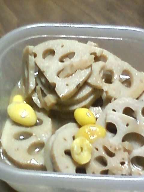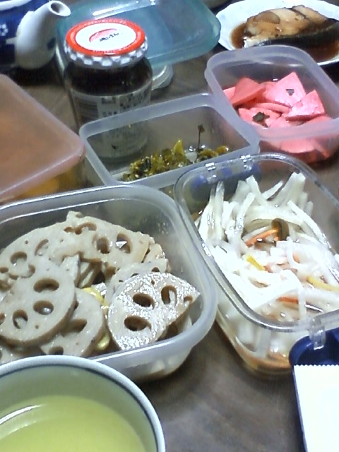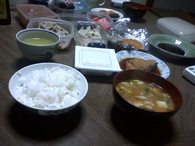 今日のごはんは、白米、みそ汁、魚の照焼き、納豆、コロッケ、れんこん、その他残り物いろいろ