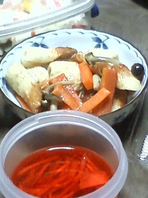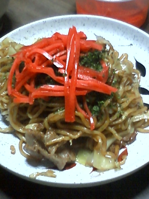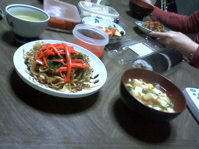 今日の昼ご飯は、焼きそば、太巻き、お吸い物、チクワの煮物、お漬物