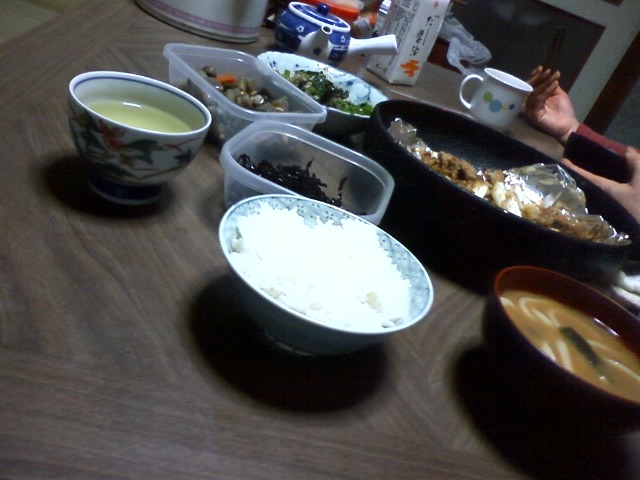 今日は、白米、うどん入りみそ汁、豚肉とネギ焼、昆布の佃煮、豆とかの煮物、ホウレン草のおひたし