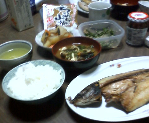 今日の昼ごはんは、白米、みそ汁、ほっけ、大根の煮物、ほうれん草