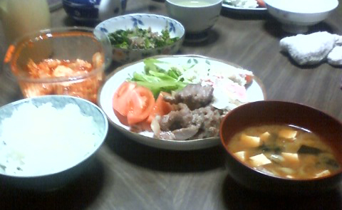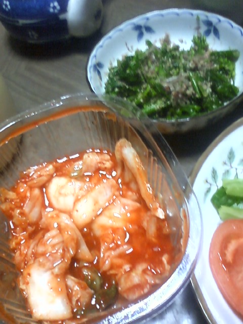 今日のごはんは、白米、みそ汁、肉+野菜、キムチ、菜の花