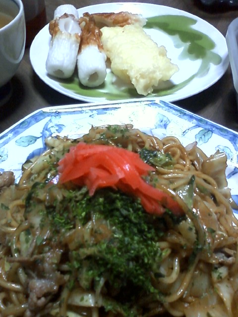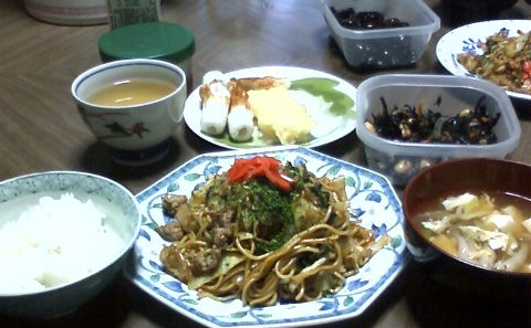 焼きそば、白米、汁、いか天、ちくわ、ひじき、豆