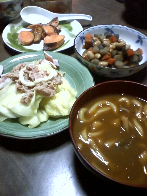 カレーうどん、温キャベツ、豆とか煮たやつ、鮭