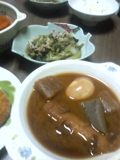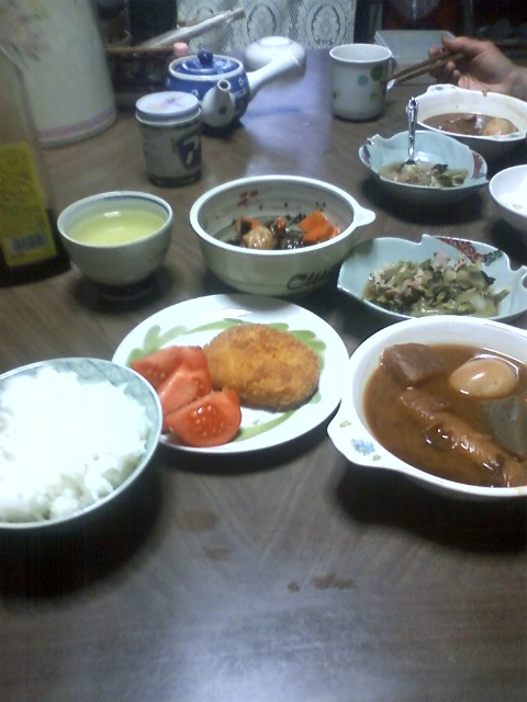 はいはい、さてさて今日の昼ご飯は、白米、みそおでん、コロッケ、トマト、菜っ葉の煮物、ニンジンとしいたけの煮物