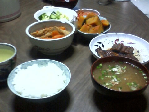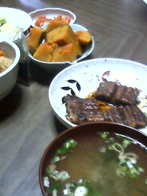 手前から、みそ汁、うなぎ、かぼちゃ、キムチ