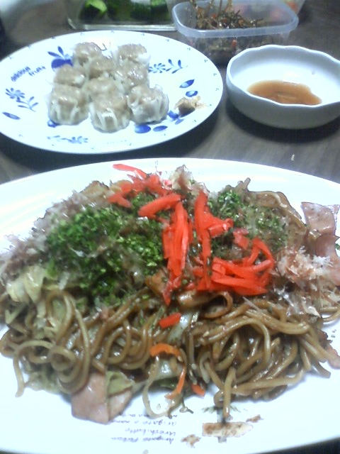 今日の昼ご飯は、焼きそば、白米、汁物、シュウマイ、タケノコ、キンピラごぼう、つけもの