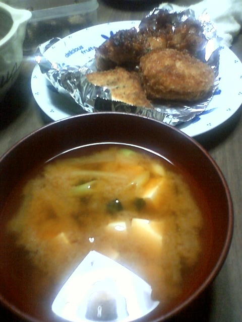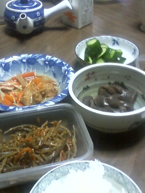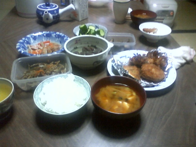 機能の昼ご飯は、白米、みそ汁、揚げ物各種、キンピラ、こんにゃく、煮物、キュウリ