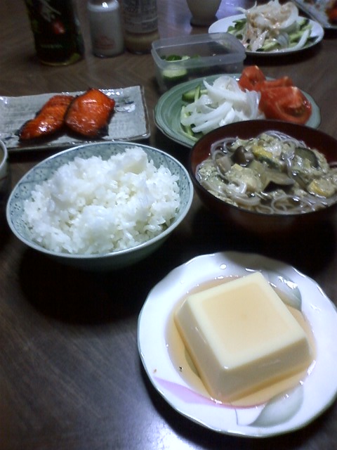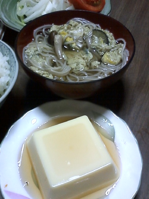 今日の昼ご飯は、白米、そうめん、玉子とうふ、魚の照焼き、野菜、漬物