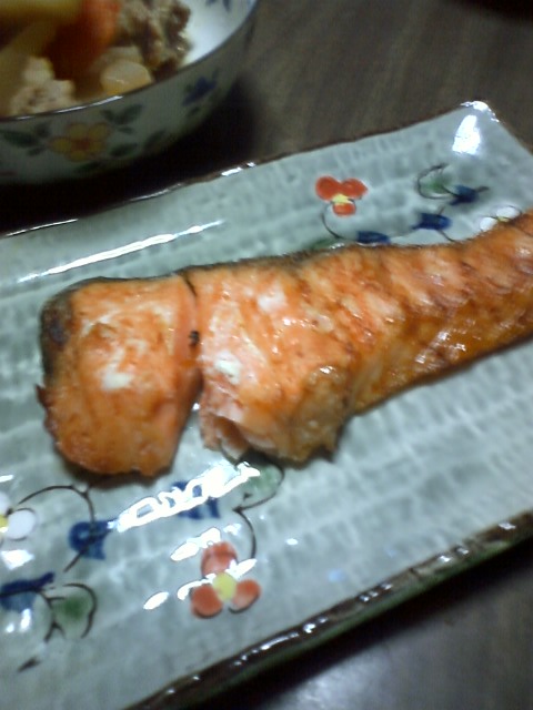 今日のごはんは、白米、みそ汁、焼き鮭、肉じゃが、玉子焼き、白菜の漬物