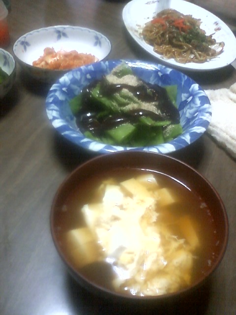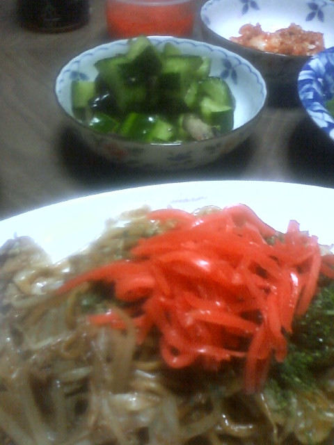 昼ご飯は、焼きそば、お吸い物、でっかいインゲンのみそ和え、きゅうりの浅漬け、キムチ