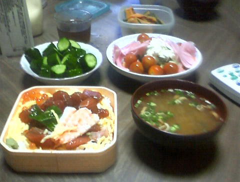 今日は、チラシ寿司、みそ汁、サラダ、きゅうりの浅漬け、かぼちゃ