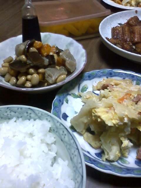 今日の昼ごはんは、白米、みそ汁、うなぎ、野菜炒め卵とじ、豆tオこんにゃくの煮物、お漬け物