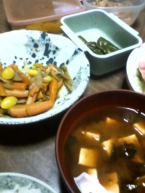みそ汁とごぼうとニンジンとぎんなんの煮物と焼きピーマン