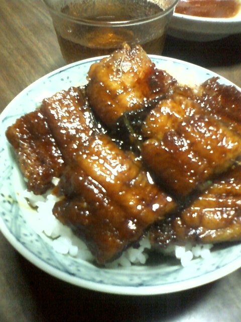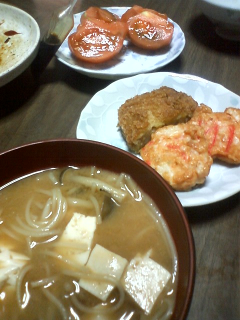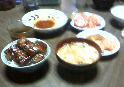 今日の昼ご飯は、うなぎ、みそ汁、なんかの練り物、コロッケ1/2、トマト