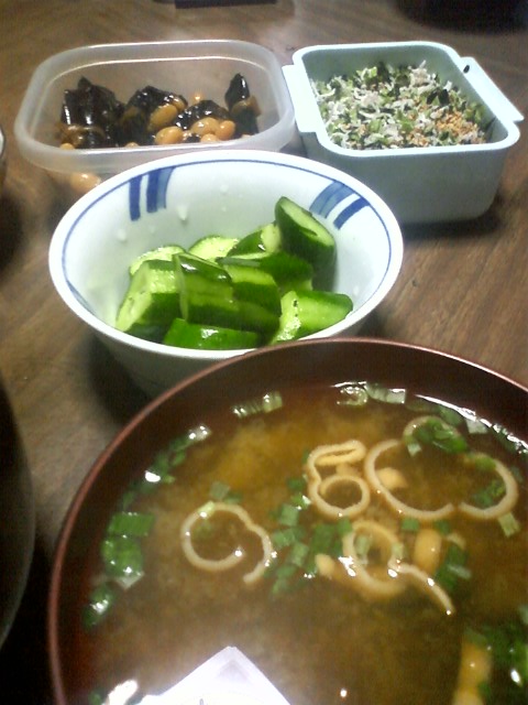 みそ汁ときゅうりの浅漬け、豆&昆布巻き、じゃこのふりかけ