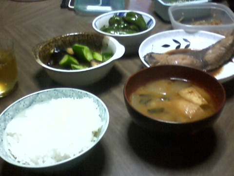 今日の昼ご飯は、白米、みそ汁、きゅうりとナスの浅漬け、煮魚、焼きピーマン、キンピラゴボウ、フリカケ