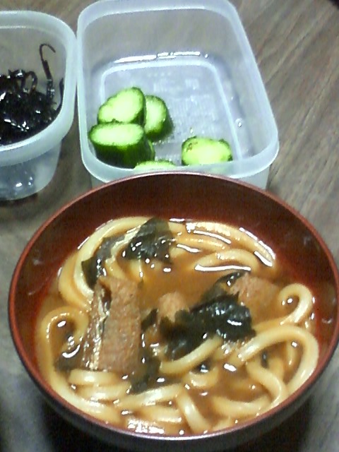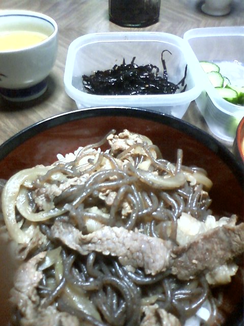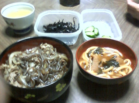 今日のお昼ごはんは、おかん風牛丼、みそ汁うどん、昆布の佃煮、きゅうりの浅漬け