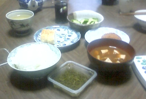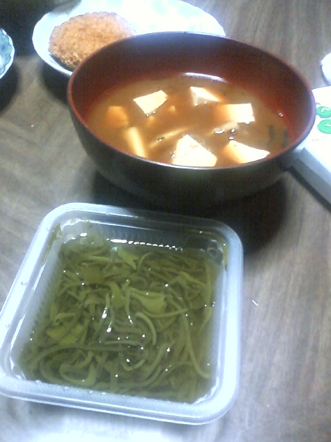 今日の昼ご飯は、白米、みそ汁、めかぶ?、玉子焼き、コロッケ、きゅうりの浅漬け