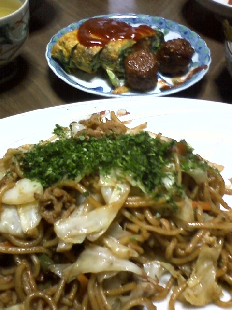 今日の昼ご飯は、焼きそば、みそ汁、玉子焼き、肉団子、焼きピーマン+ぎんなん、トマト