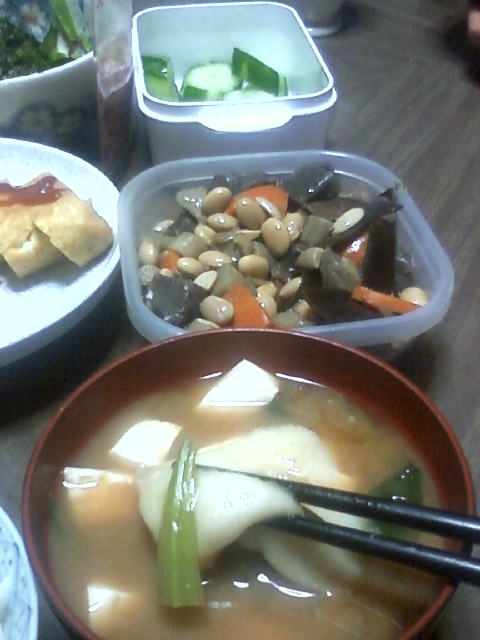 今日の昼ご飯は、白米、みそ汁雑煮?、玉子焼き、煮豆、ほうれん草のおひたし、きゅうりの浅漬け