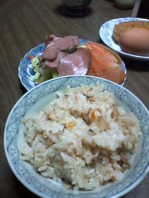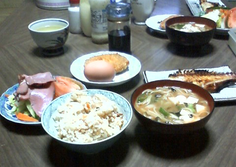 今日の昼ご飯は、炊き込みご飯、みそ汁、焼き魚、サラダ、コロッケ、ゆで卵