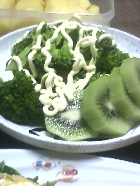 ほれ!ブロッコリーとキウイ一緒にするから、キウイにマヨネーズかかってしまってるやん!