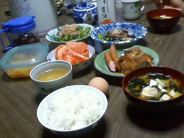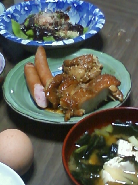 今日のごはんは、白米、みそ汁テリヤキチキン、ソーセージ、トマト、インゲン、ほうれん草、ゆで卵