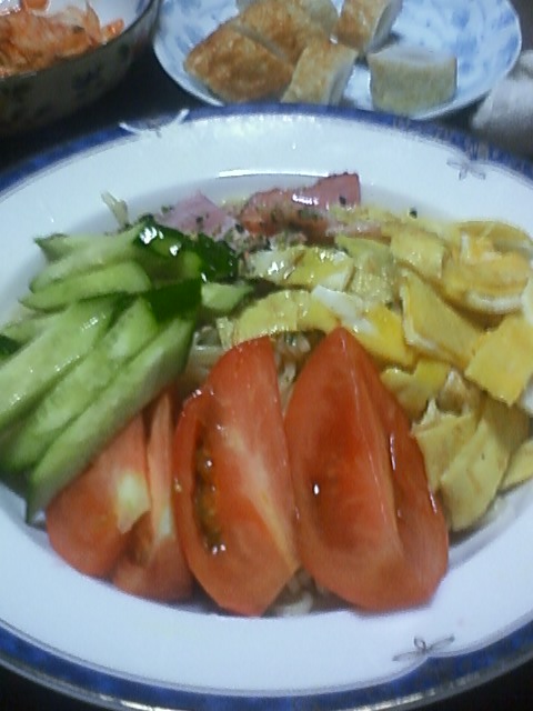 玉子以外は、昨日のサラダのキャベツが麺に変わった内容です。