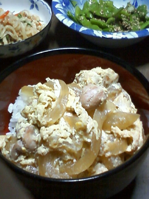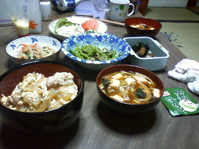 今日は、親子丼、みそ汁、切干だいこん、いんげん、野菜、なすの漬物、ふりかけ